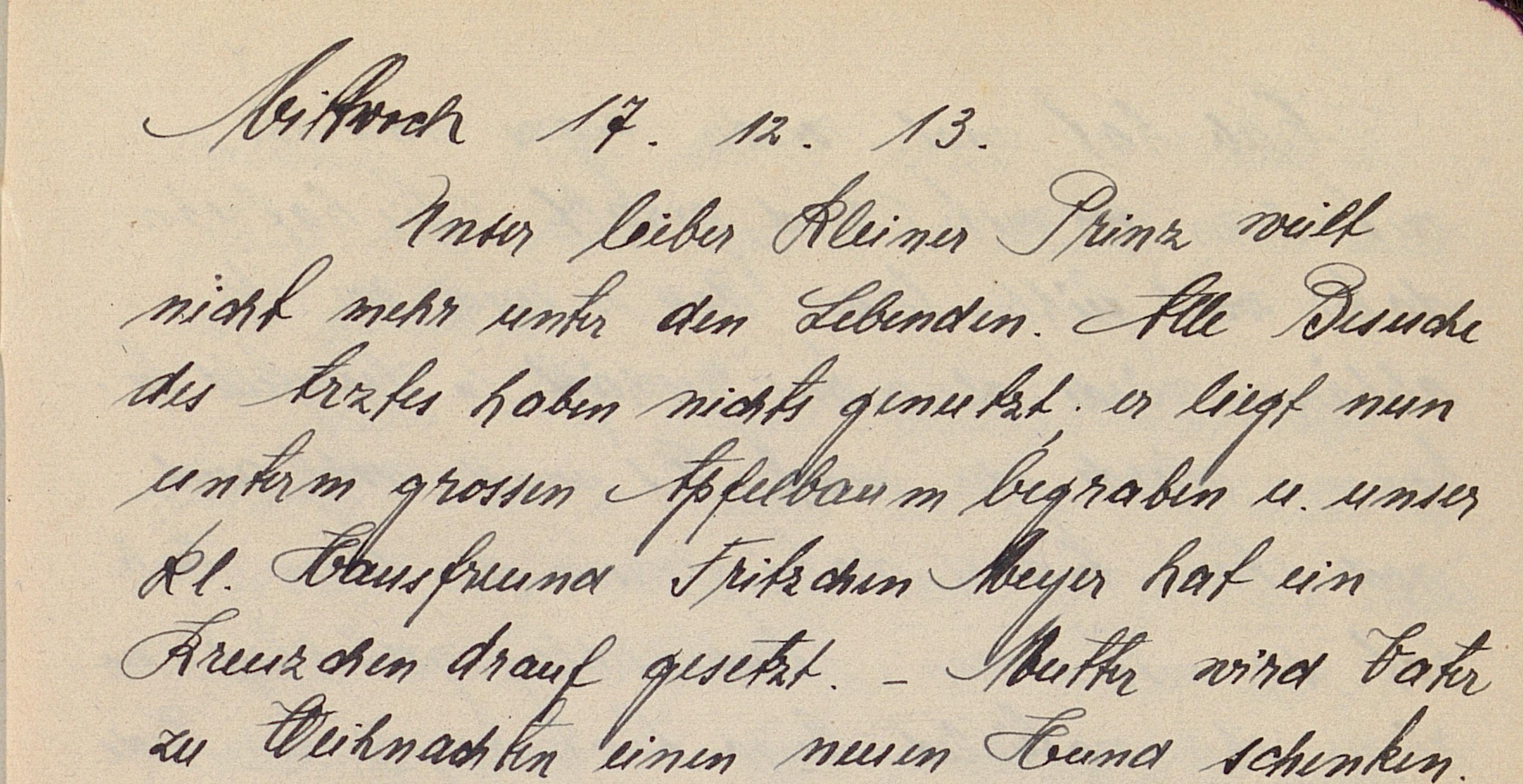 Die kleine Notiz von Anni Topheide in ihrem Tagebuch gibt Hinweise auf einige Themenstränge, denen man mit Blick auf Mensch-Tier-Beziehungen nachgehen könnte: Erstens zeigen sich Formen der vermenschlichenden Einbeziehung der Haustiere in verschiedene Rituale, hier etwa die Bestattung mit einem Kreuz auf der Grabstelle. Zweitens rücken Tiere als Geschenk in den Blick – ein Thema, das nach wie vor und gerade um Weihnachten herum Bedeutung erlangt und immer wieder zu Problemen führt. Drittens stellen sich Fragen der Kontinuität konkreter Beziehungen. Die Bindung beispielsweise zu einem bestimmten Hund führte und führt (nicht nur bei Familie Topheide) oft dazu, ihn nach seinem Ableben durch einen neuen Hund zu ersetzen, auf den die Bindung übertragen wird – und der, auch bei den Topheides, oft denselben Namen bekommt. Viertens schließlich lenkt Anni Topheides Tagebuch die Aufmerksamkeit auf den Typus Stadthund. Annis Eltern lebten in Münster. Der Vater war Buchdrucker, die Mutter Hausfrau. Es ist also davon auszugehen, dass der „liebe kleine Prinz“ ein ganz anderes Leben – und für die Familie eine ganz andere Bedeutung – hatte als Hunde auf dem Land.