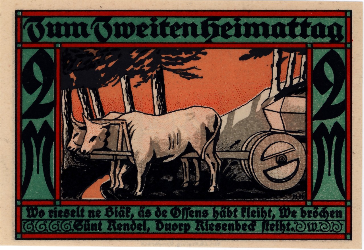 Zur Erinnerung an den zweiten Heimattag gab der Verein fünf Erinnerungsscheine in verschiedenen Wertstufen heraus. Die auf den Scheinen abgedruckte Signatur „HH“ lässt sich dem Maler und Kunsthandwerker Hermann Heinrich Hischemöller (1905 - 1968, aus Westerkappeln) zuordnen. Im Alter von nur 17 Jahren gestaltete er damals die Scheine für den Verein für Heimatkunde. Über diese Arbeit hinaus stellte er sein Können auch für weitere grafische Arbeiten im Dienst der Heimatkunde zur Verfügung. So gestaltete er unter anderem auch Titelblätter für die von Friedrich Rohlmann erstellten Heimatbücher.