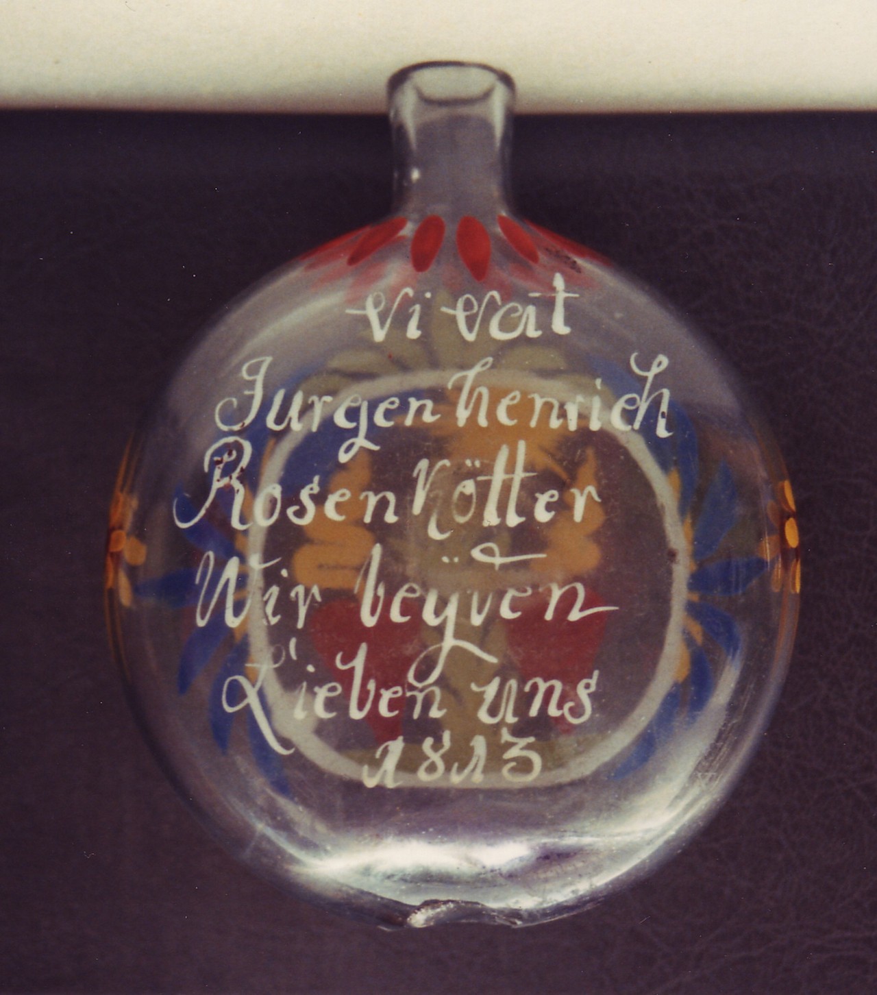 Solche bunt bemalten Flaschen aus Weißglas waren im 18. und Anfang des 19. Jahrhunderts beliebte Hochzeitsgaben der Eheleute untereinander, die als Erinnerung aufbewahrt wurden. Die farbliche Gestaltung und Beschriftung der Flaschen wurde in den Glasbrennereien im Auftrag der Kunden vorgenommen. Auftraggeberin der vorliegenden Flasche war vermutlich die Verlobte von Jürgen Henrich. Sie lässt ihren zukünftigen Ehemann per Inschrift hochleben und bekräftigt: „Wir beÿden lieben uns.“