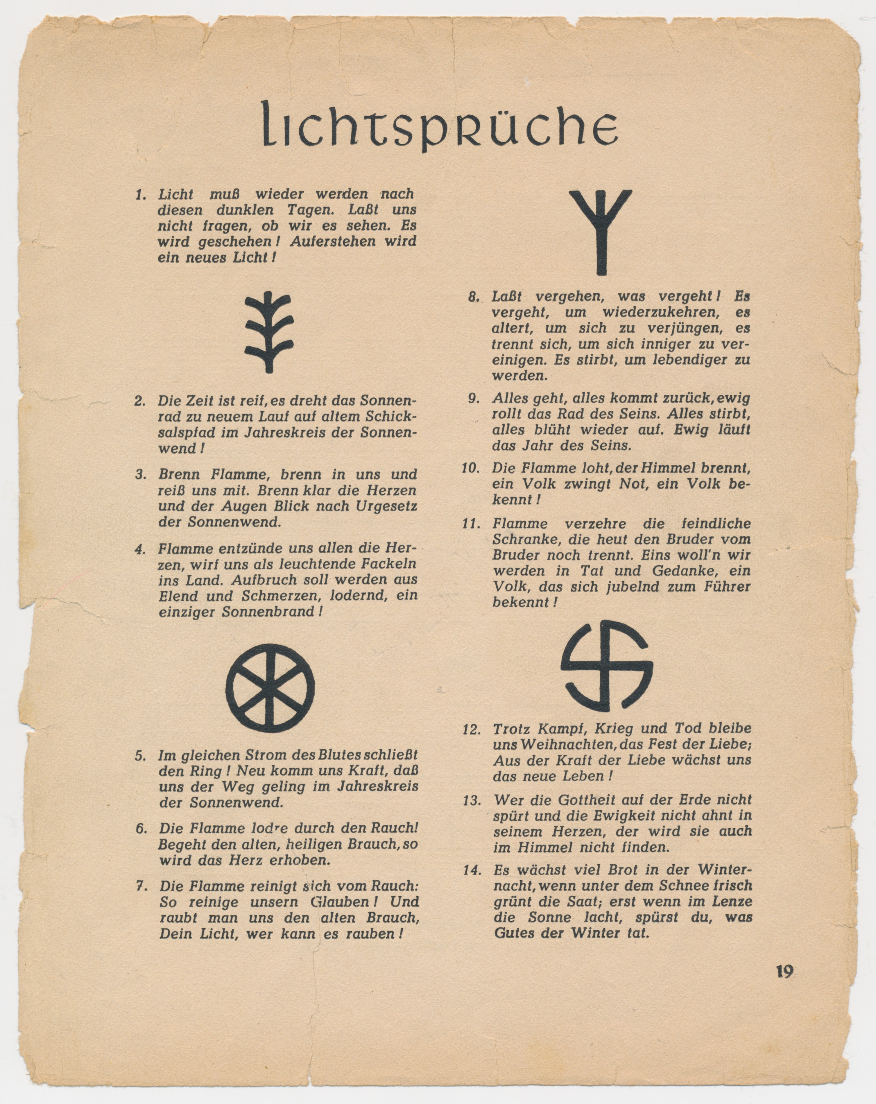 Ein jüdischer Knabe als Anlass für das Weihnachtsfest – das passte so gar nicht in die Gedankenwelt und die Ideologie der Nationalsozialisten. Und da Weihnachten in der abendländischen Kultur so tief verankert ist wie kein anders Fest galt es, am Weihnachtstermin ein „Julfest“ angeblich germanischen Ursprungs als Alternative zum christlichen Weihnachtsfest zu institutionalisieren. Christliche jahreszeitliche Symbole und Rituale sollten durch nationalsozialistische Zeichen und Festformen ersetzt werden.