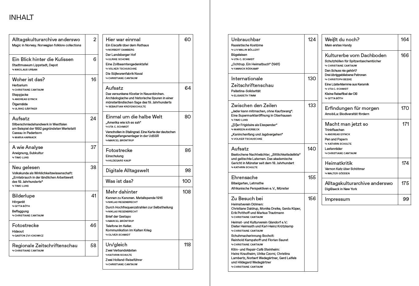 In seinem Aufsatz entschlüsselt Sebastian Kreyenschulte die Sage über ein verschwundenes Kloster in Neuenkirchen als verdichtete, kaum noch erkennbare Überlieferung historischer Begebenheiten der Region. Maria Harnack informiert in ihrem Aufsatz über das Silberschmiedehandwerk in Westfalen und die Werkstatt Cassau aus Paderborn. Kathrin Schulte erinnert daran, dass die Universität in Münster bis Anfang des 20. Jahrhunderts einen Karzer betrieb, der zur Bestrafung und Disziplinierung von Studenten diente. Als Dachbodenfund stellt Christoph Beeke ein Bolzenschussgerät mit drei übriggebliebenen Patronen vor und Timo Luks reflektiert die Angebote einer Supermarkteröffnung in den 1970er Jahren. Dass früher nicht alles besser war, und dass das, was wir ‚Bräuche‘ nennen, sich im Laufe der Geschichte verändert, zeigt ein Beitrag über rassistische Karnevalskostüme.