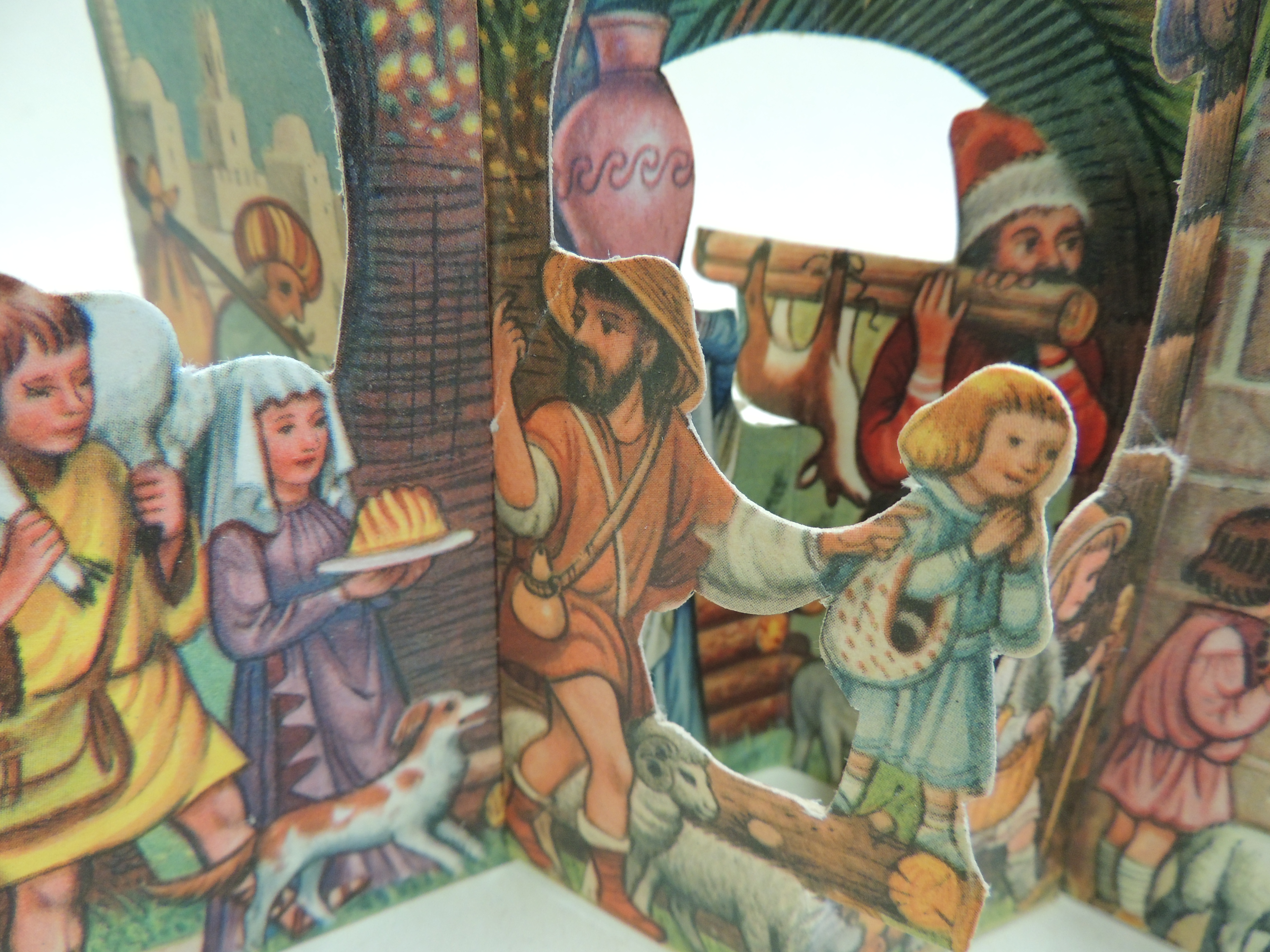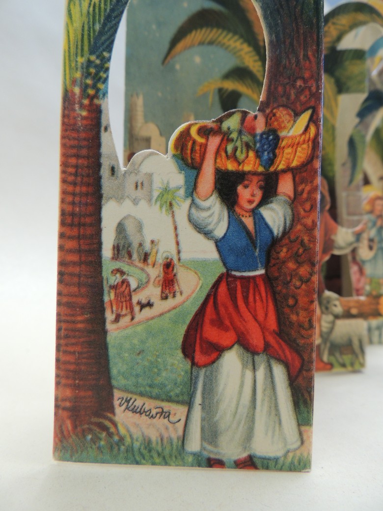 Auch die vorliegende Krippe mag man auf den ersten Blick zunächst in die erste Hälfte des 20. Jahrhunderts einordnen. Bei der Gestaltung könnte man an eine Darstellung aus den 1930er Jahren denken. Durch den Klappmechanismus lässt sich die Krippe auf ein handliches Briefformat zusammenfalten. Aufgebaut hat sie Ausmaße von 18x46 Zentimetern. Die vier Pappelemente werden in einander gesteckt und können so eine dreidimensionale Anmutung entfalten.