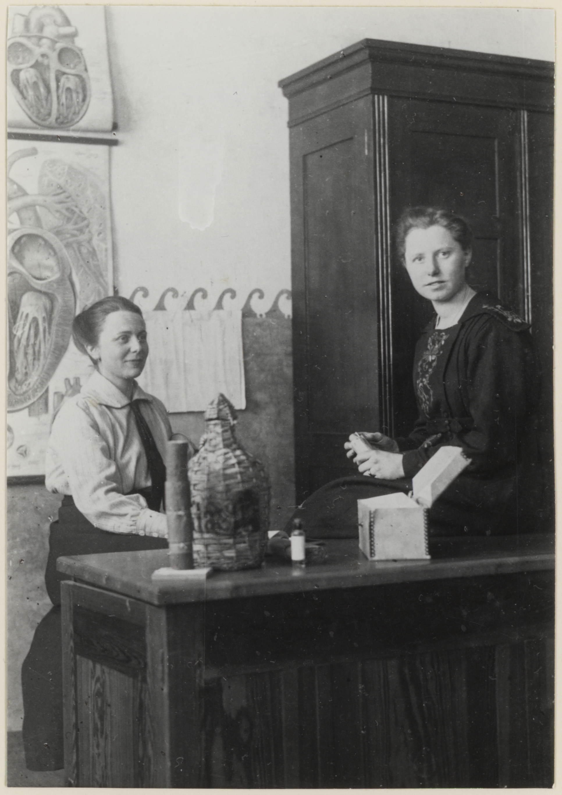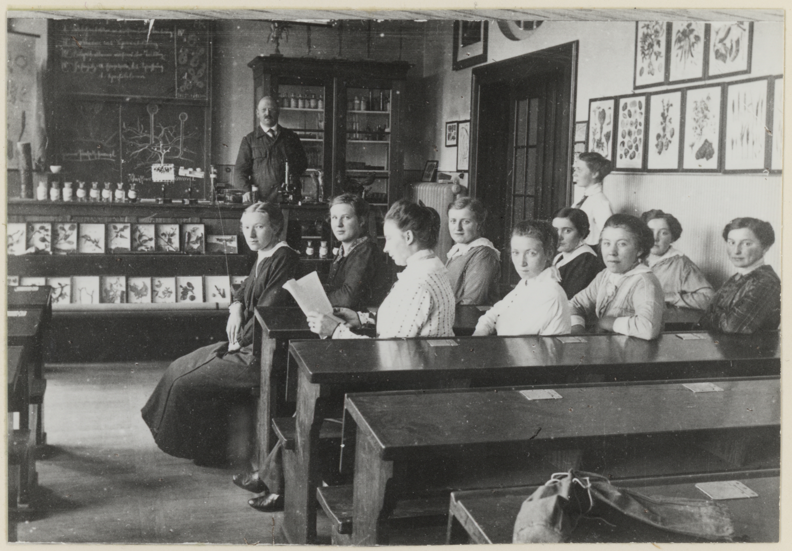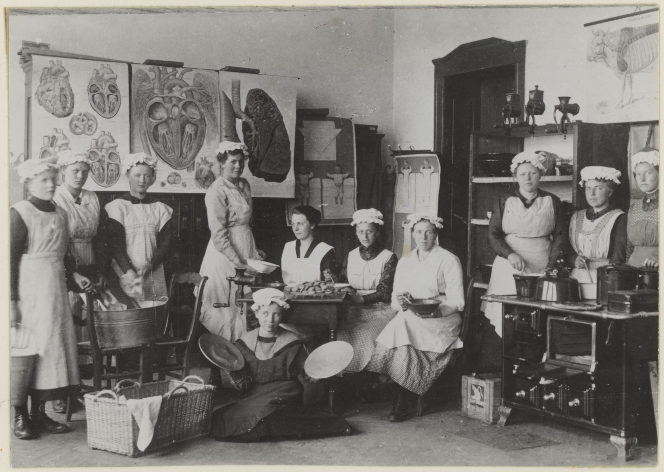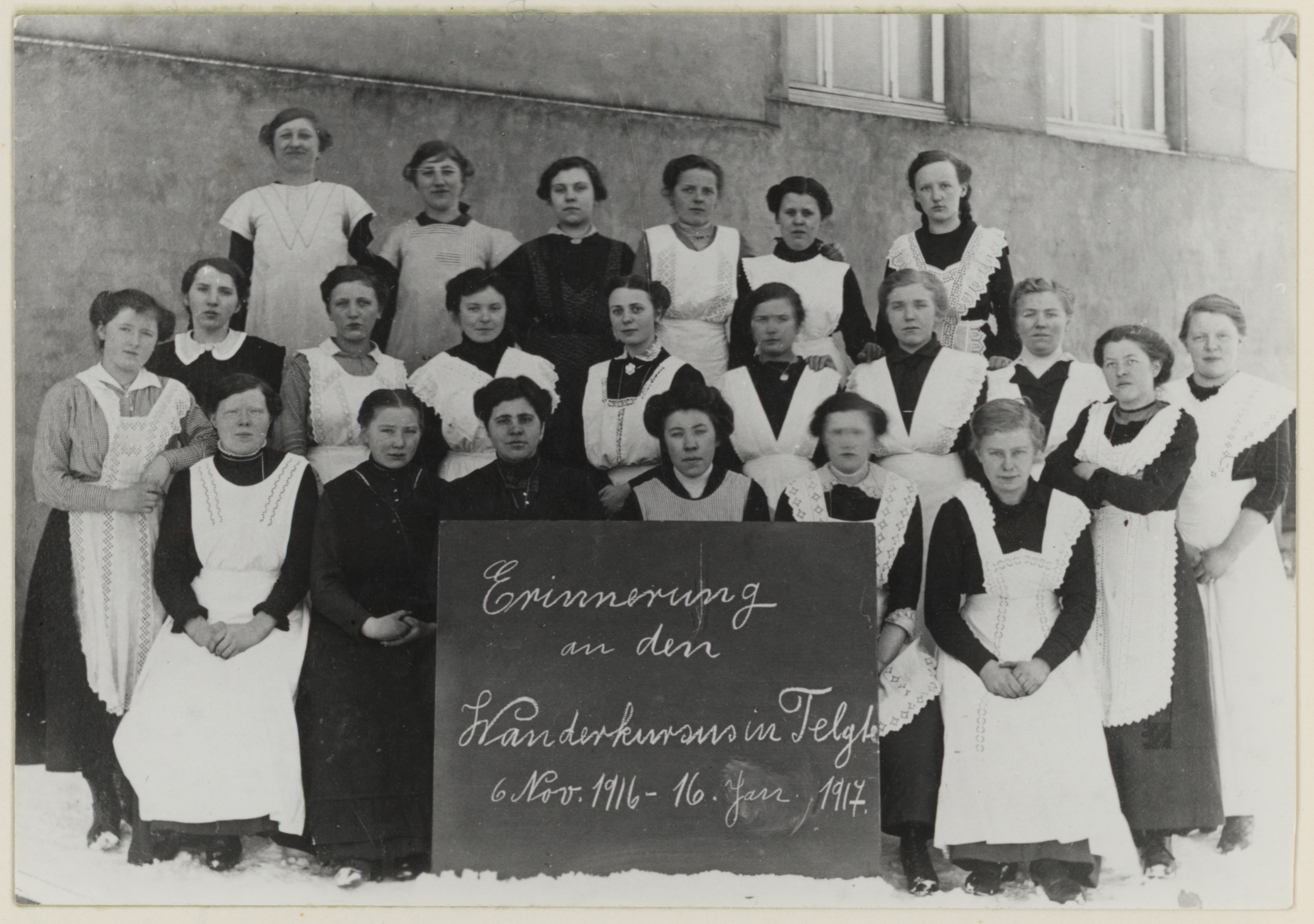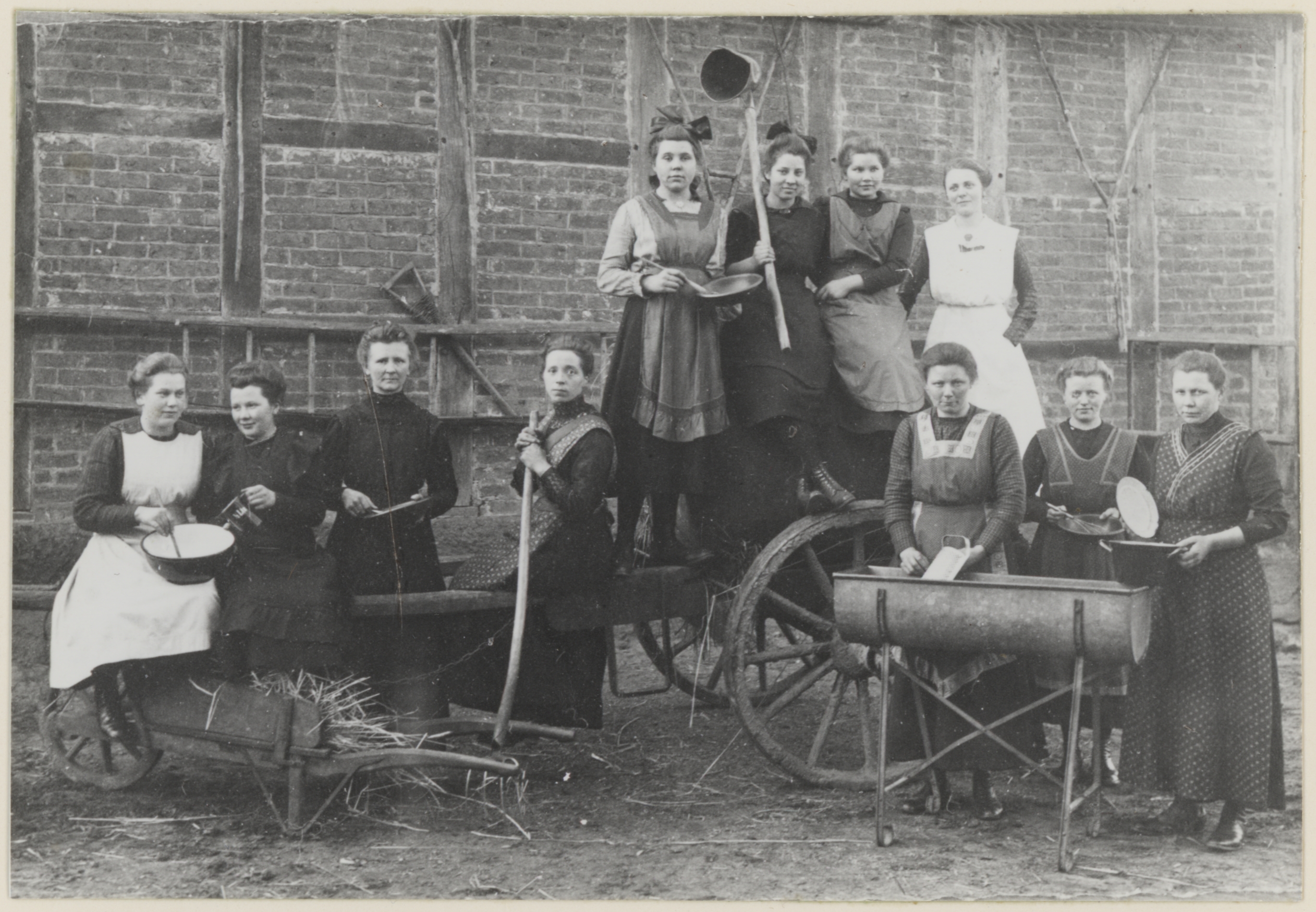 Ein wenig seltsam ist das Foto schon: Da stehen elf mit unterschiedlichen Küchenschürzen bekleidete Frauen vor einer Fachwerkwand. Viele von ihnen halten Haushaltsgegenstände – Pfanne, Topf, Schneebesen, Kochlöffel, Milchkännchen oder Schüssel – in der Hand, die in diesem Setting aber keinen praktischen Nutzen erfüllen. In Gruppen zu je drei oder vier Personen stehen und sitzen die Frauen auf und neben einer Sturzkarre; eine Schubkarre und ein Waschtrog sind auch zu sehen. Ohne die Bildbeschriftung bliebe ein solches Foto vermutlich bis in alle Zeit rätselhaft, aber 1965, als eine Reproduktion ins Bildarchiv der Kommission Alltagskulturforschung gelangte, wurde glücklicherweise auch nach Aufnahmeort und -zeit der sowie nach dem Anlass für die Fotografie gefragt. Laut Bildbeschriftung handelt es sich um einen „Kursus“ der Kreiswanderhaushaltungsschule in Gelmer. Er fand 1919 im Gasthof „Zur Schiffahrt“ statt. Die Aufnahme von der Veranstaltung stammt – ebenso wie 42 weitere Fotografien – laut Aufschrift auf der zugehörigen Bildkarte aus dem Besitz von „Frau A. Brirup, Mstr.“. Die wenigen Angaben genügen, um sich auf die Spuren eines speziellen Fortbildungsangebotes für die heranwachsende weibliche Jugend auf dem Land zu begeben.