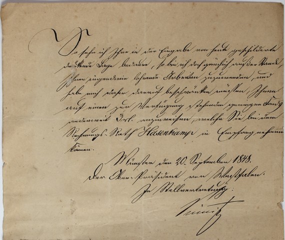 „So sehr ich Ihre in der Eingabe von heute geschilderte drückende Lage bedaure, so bin ich doch gänzlich außer Stande, Ihnen irgendwie lohnende Arbeiten zuzuwenden, und habe mich daher darauf beschränken müssen, Ihnen auf einen zur Verfügung stehenden geringen Fonds ›Anderweit‹ drei Reichstaler anzuweisen, welche Sie bei dem Rechnungsrath Hasenkamp in Empfang nehmen können.“